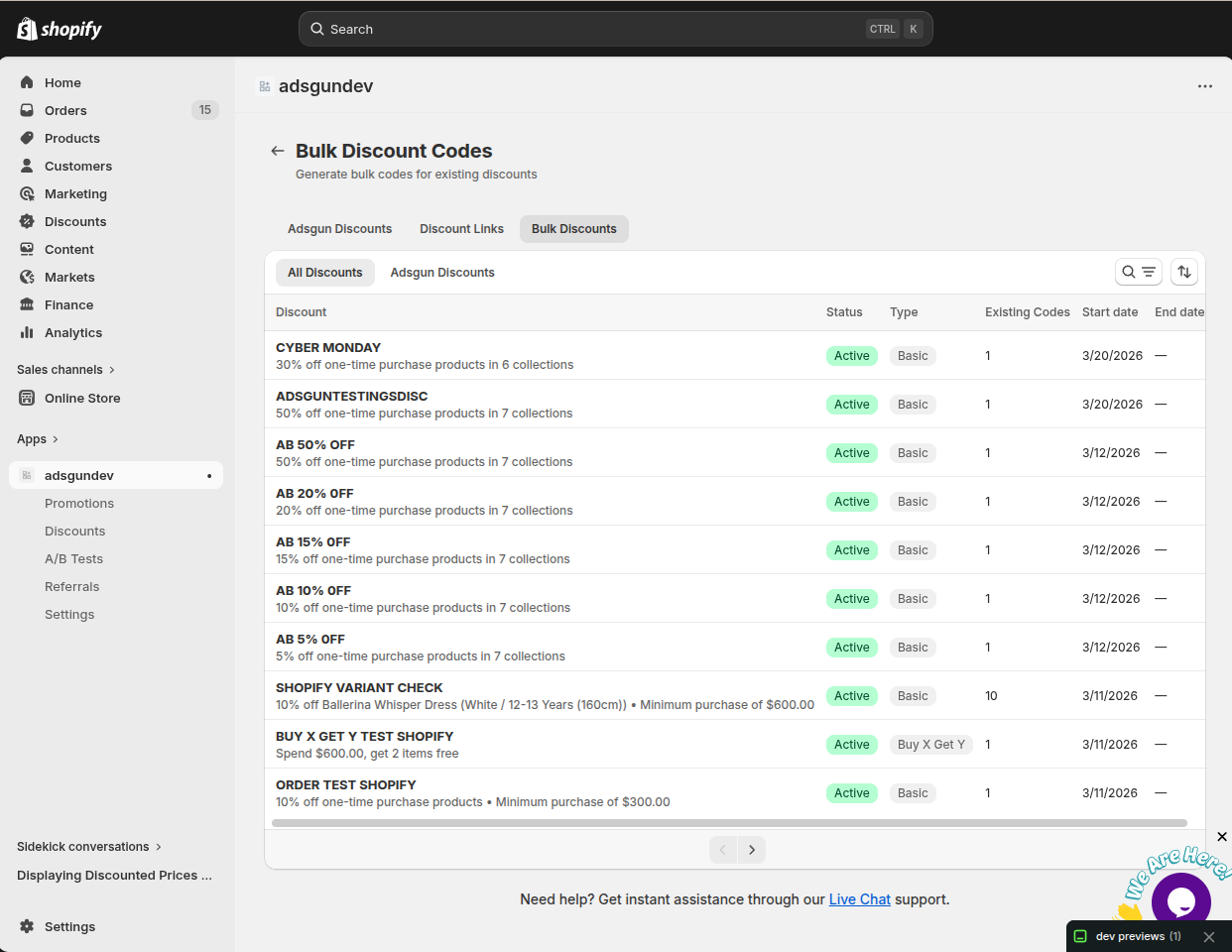 Bulk Discount Codes lets you generate hundreds or thousands of unique discount codes for any existing discount in seconds – without leaving Adsgun. Works with both native Shopify discounts and Adsgun Discounts.