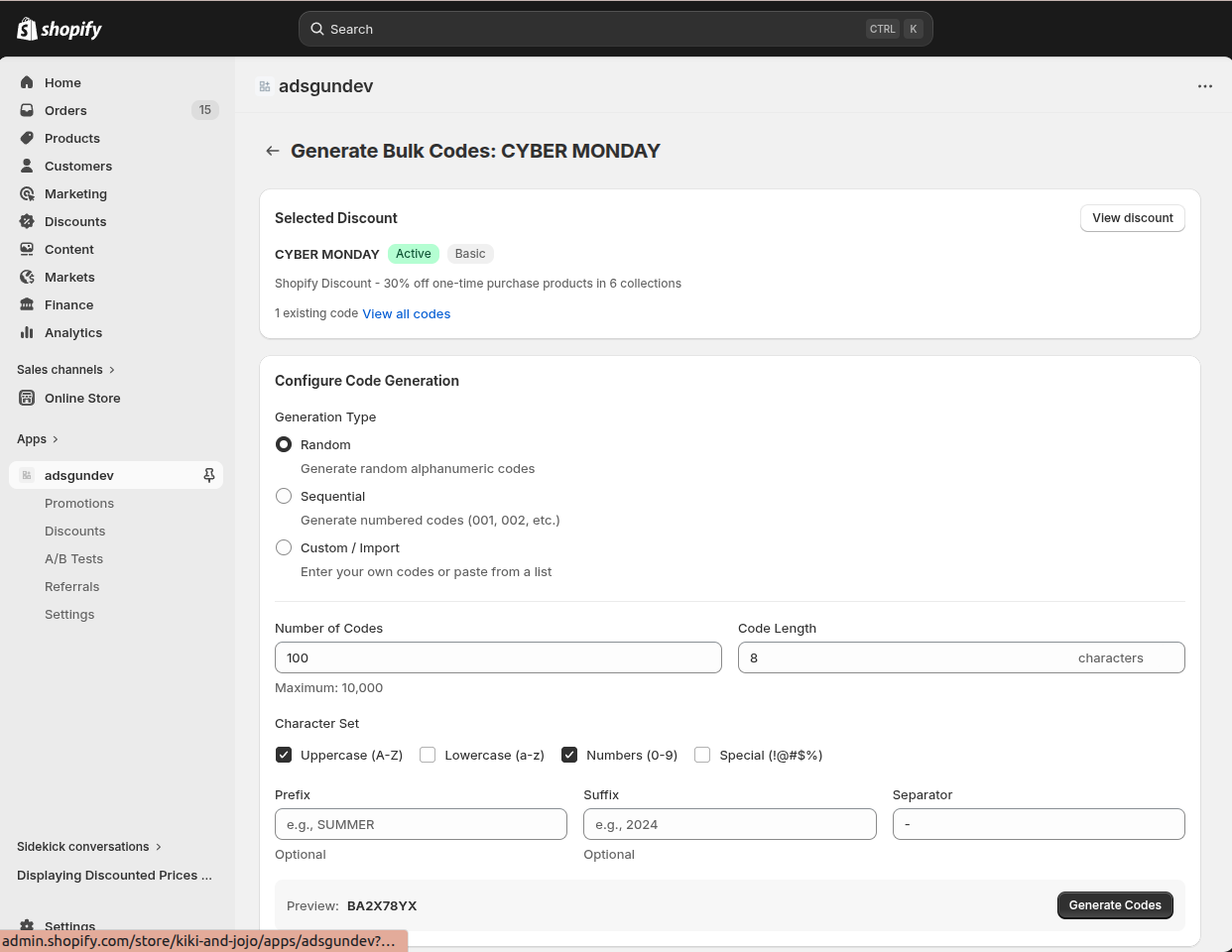 | Separator | The character placed between the prefix/suffix and the generated code. Defaults to a hyphen. | – |