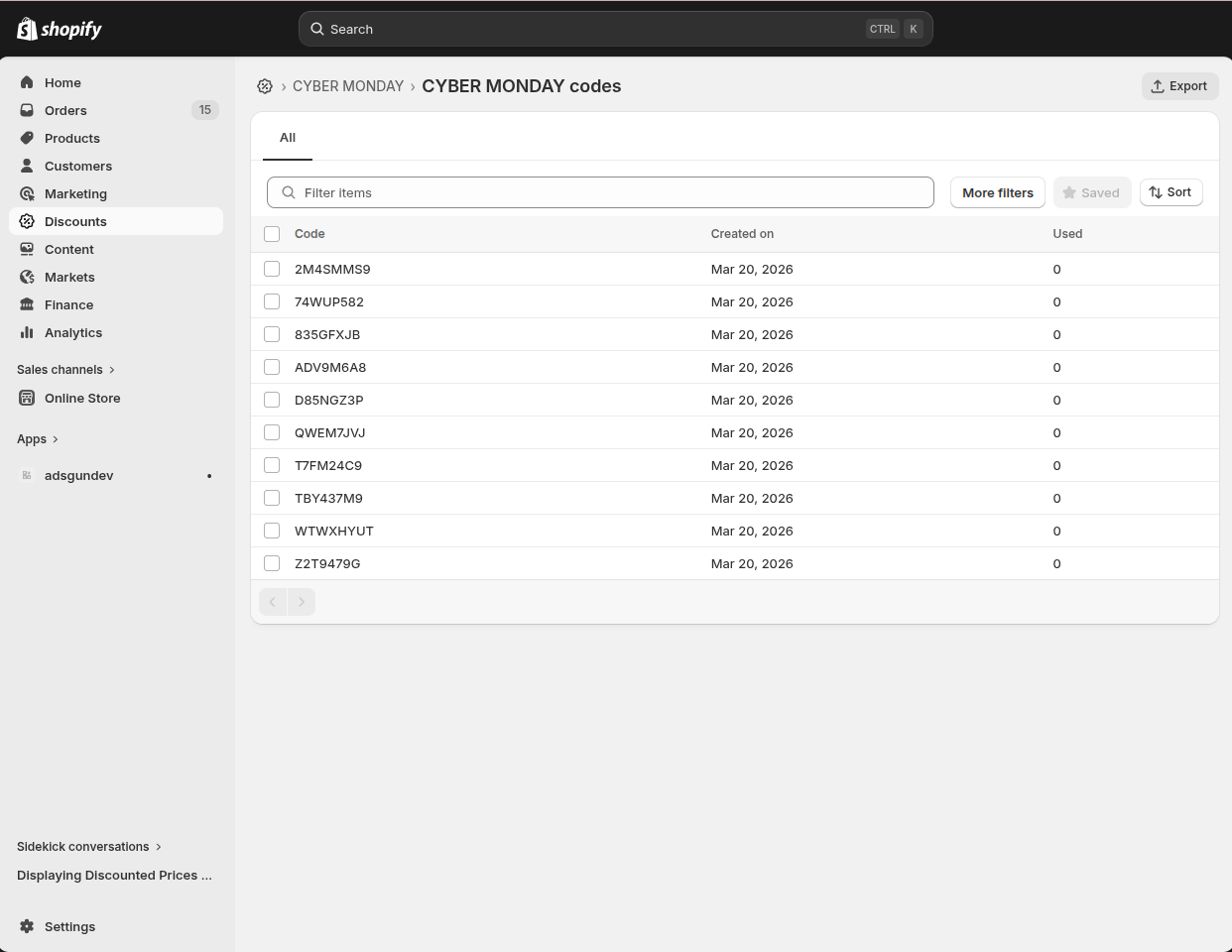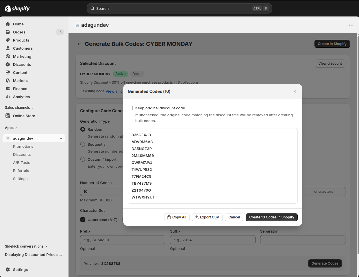 After clicking Create in Shopify, all generated codes are pushed to your Shopify Admin and attached to the selected discount. You can verify this directly in Shopify.