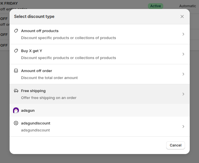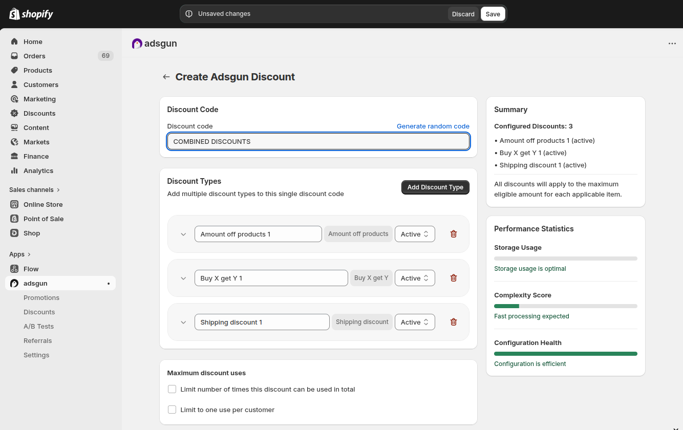 In addition to native Shopify discounts, Adsgun has its own built-in discount system called Adsgun Discounts. These are managed entirely within the Adsgun app and give you significantly more flexibility than what Shopify natively allows.