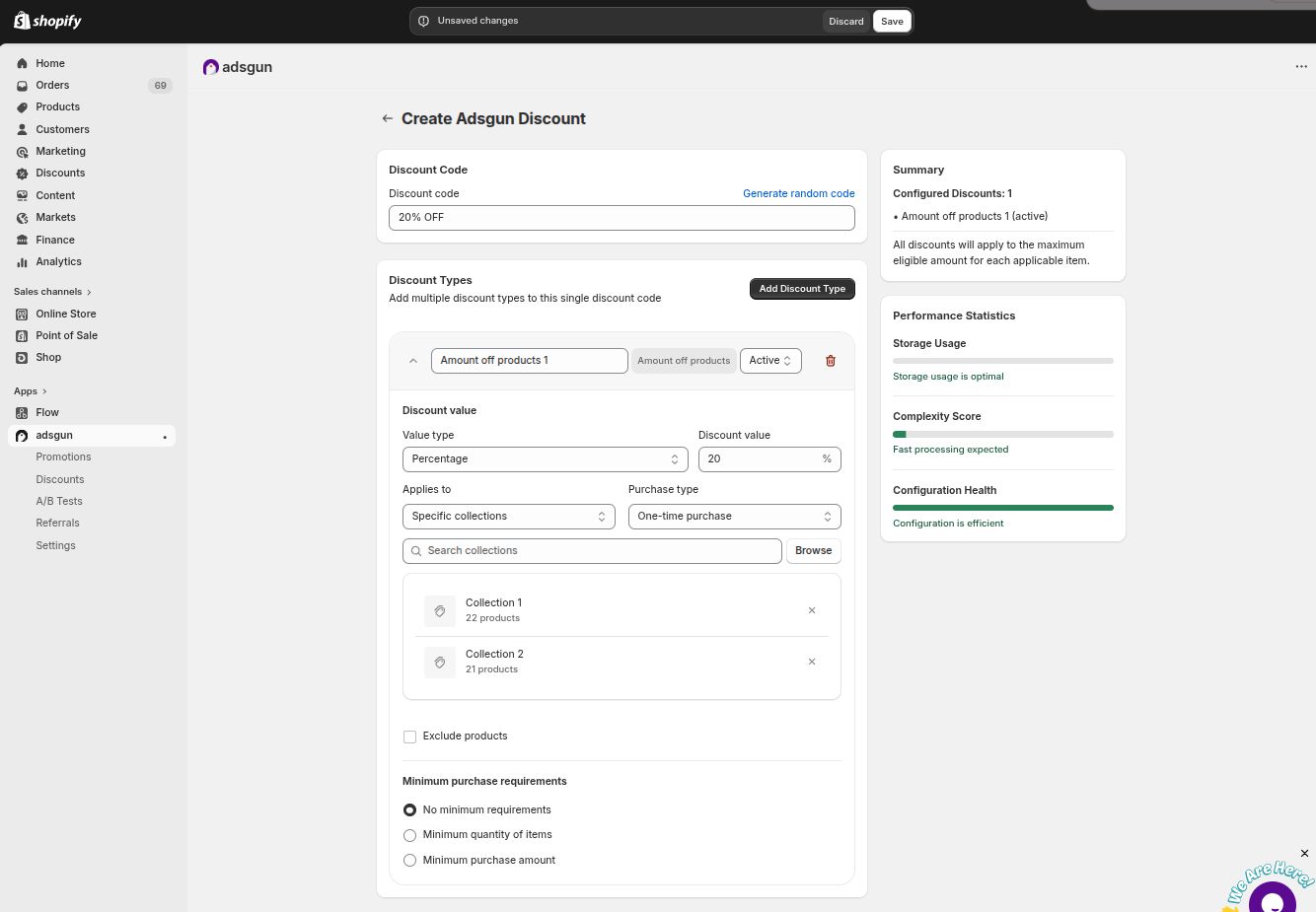 Save the Adsgun Discount. The discount is now ready to use in your Adsgun campaigns, display rules, or to share directly with customers.