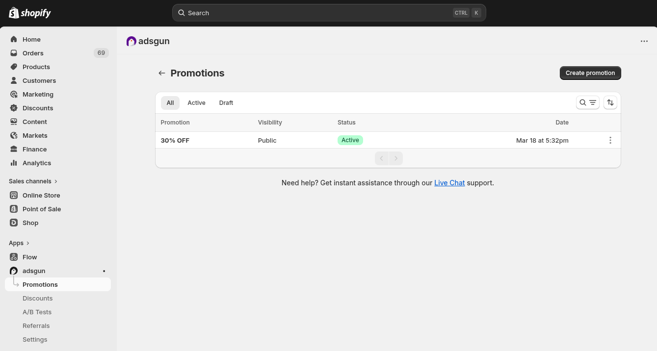 3. In the Adsgun navigation, click Promotions. This is where all your promotions are listed and managed.